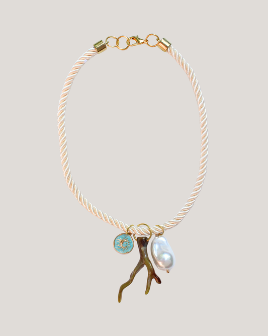 COLLAR CORDÓN BLANCO PERLA MEDALLA Y CORAL VERDE